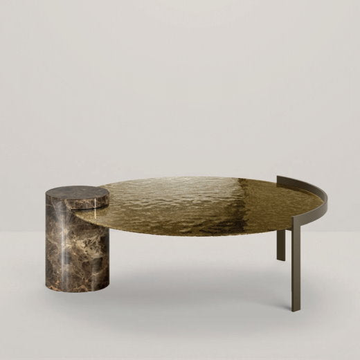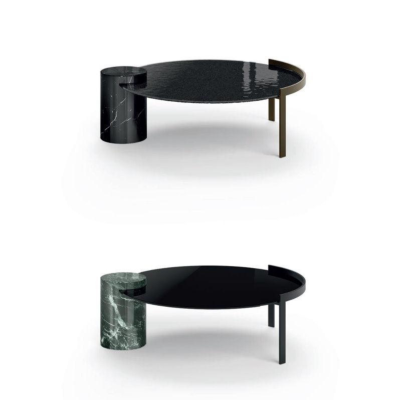 The Orbit Coffee table combines natural marble for the column, glass for the top and metal for the base to create a personalized composition.