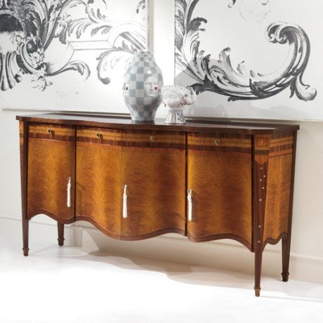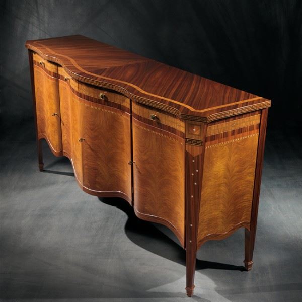 The sides are inclined and the front is richly rounded with doors in cerejeira featherband veneer and the end in palisander relief work.