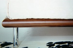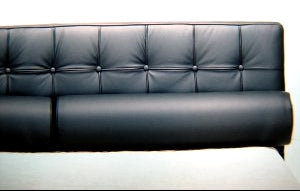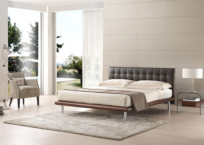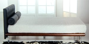 Our Mies bed is a completely new design that embodies the clean minimalism of the International Style. Inspired by the famous Mies Van der Rohe Day Bed, this platform bed features a distinctive tufted headboard. The glove soft, full grain aniline-dyed leather is hard sewn using individual squares of leather and trimmed with piping over the seams. Leather covered buttons enhance the deep tufting. The thick, rounded solid hardwood frame in a walnut stain is supported by tubular chromed steel legs. Plastic inserts inside the leg tips protect floors. Flexible beechwood slats eliminate the need for a bulky box spring and allow air to circulate beneath the mattress.
