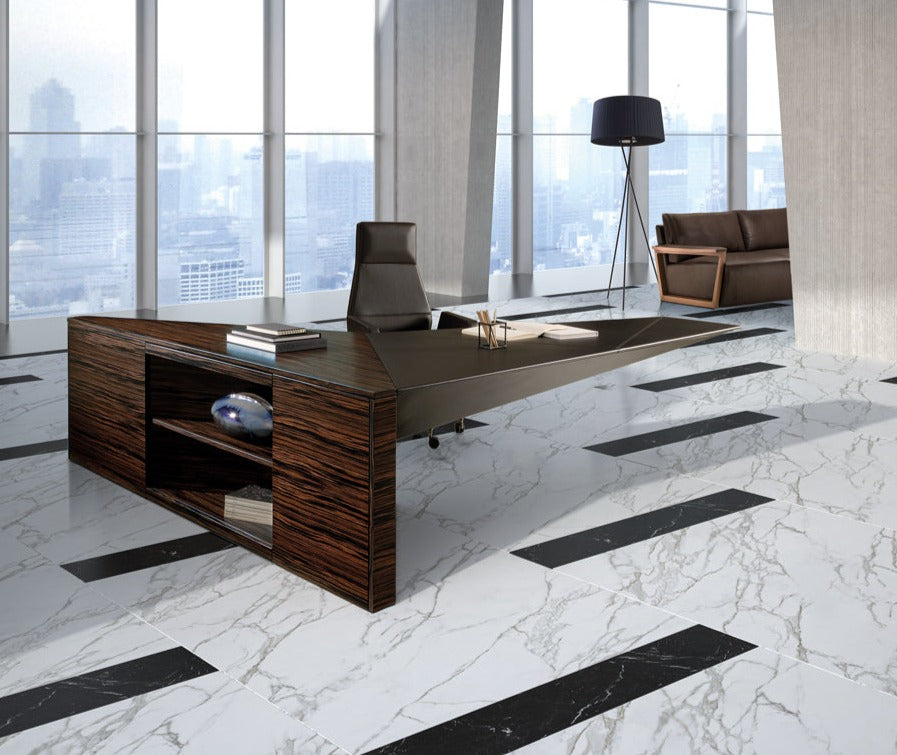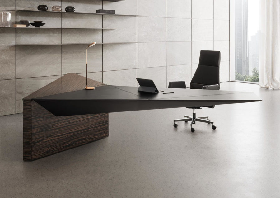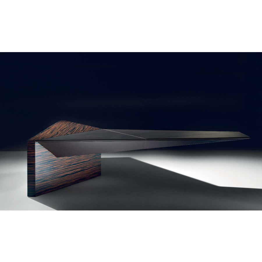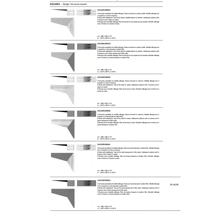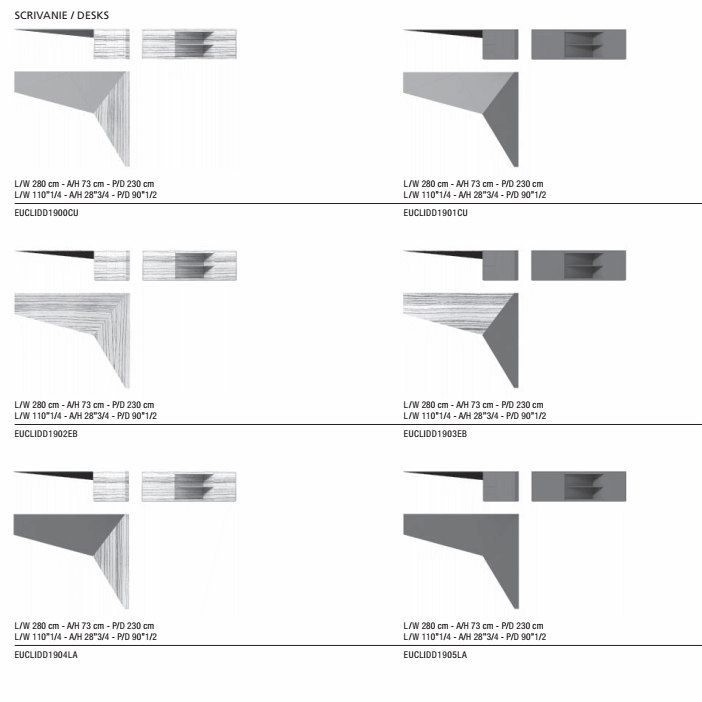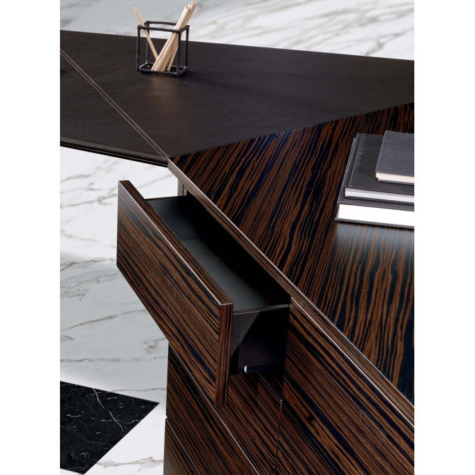 Furthermore, Euclideo finishings are part of the expressive and stylistic language of the system, further defining the functions of each component. The suspended worktop, which seems almost to defy the laws of gravity, contrasts with the solid space of the sideboard that counteracts, even optically, the balance. The possibility of choosing between a range of different wood essences, ranging from exotic woods to the most traditional ones, make the whole of this executive desk even more unique and exclusive.