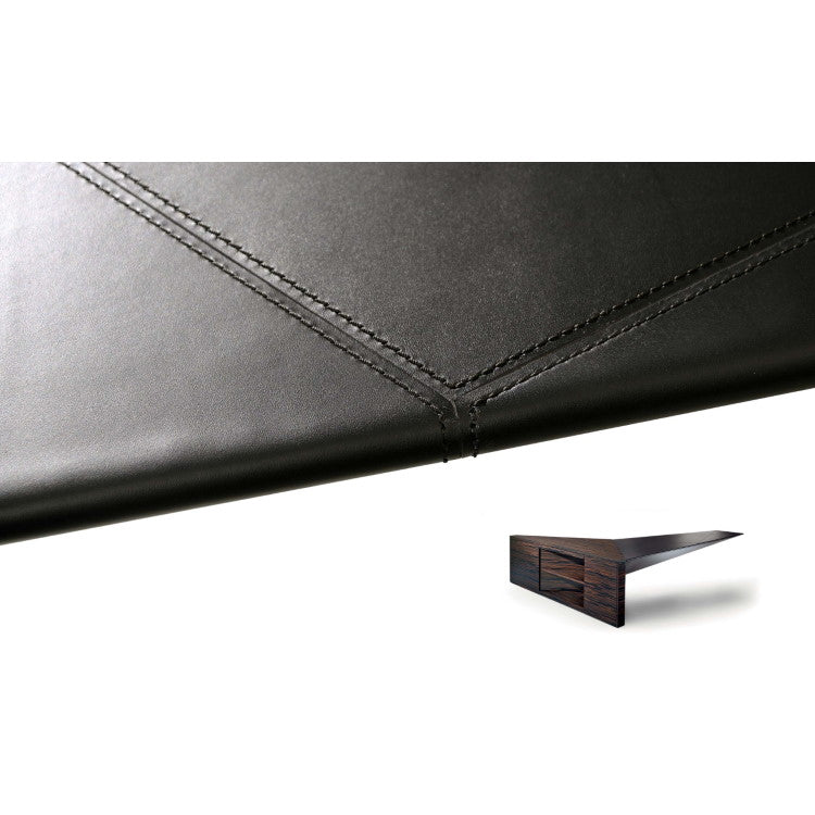melamine coated panel covered in saddle leather or soft leather. The top rests on a black painted steel frame which is itself fixed