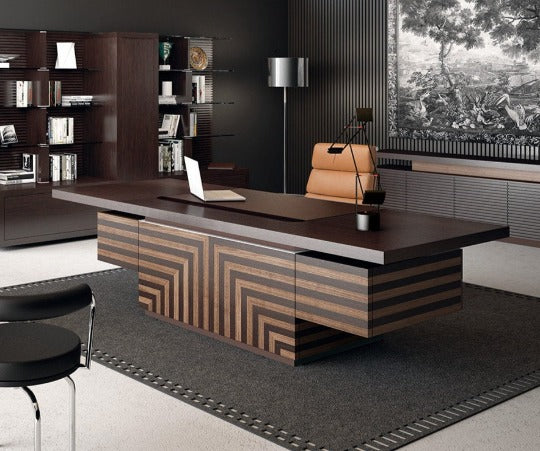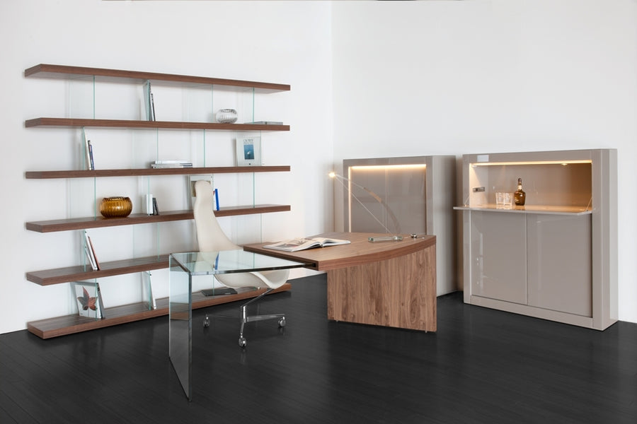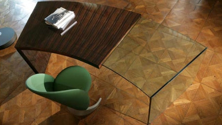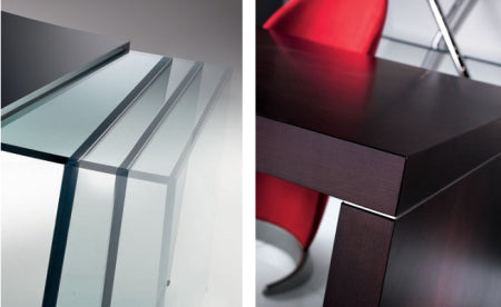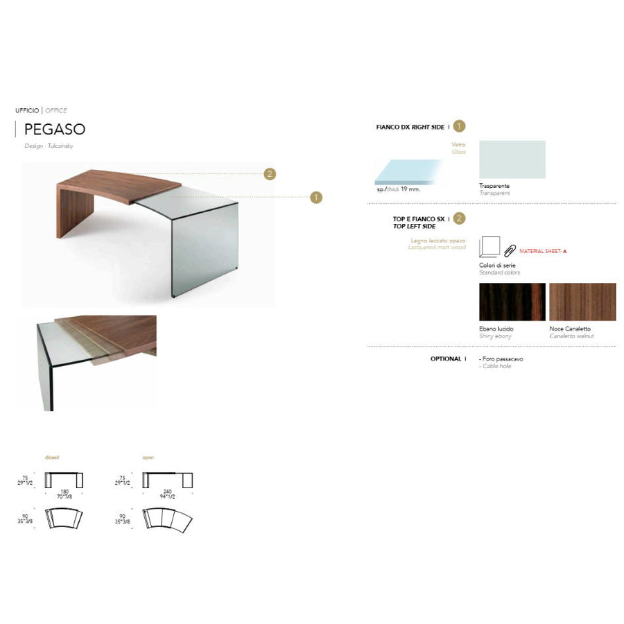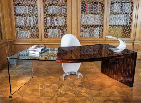Desk with wooden movable top and 19 mm thick glass side. Available in Canaletto Walnut, Canaletto Henné, matt lacquered wood or shiny lacquered Ebony , brass, dark brass, titanium finish. Optional cable-hole.