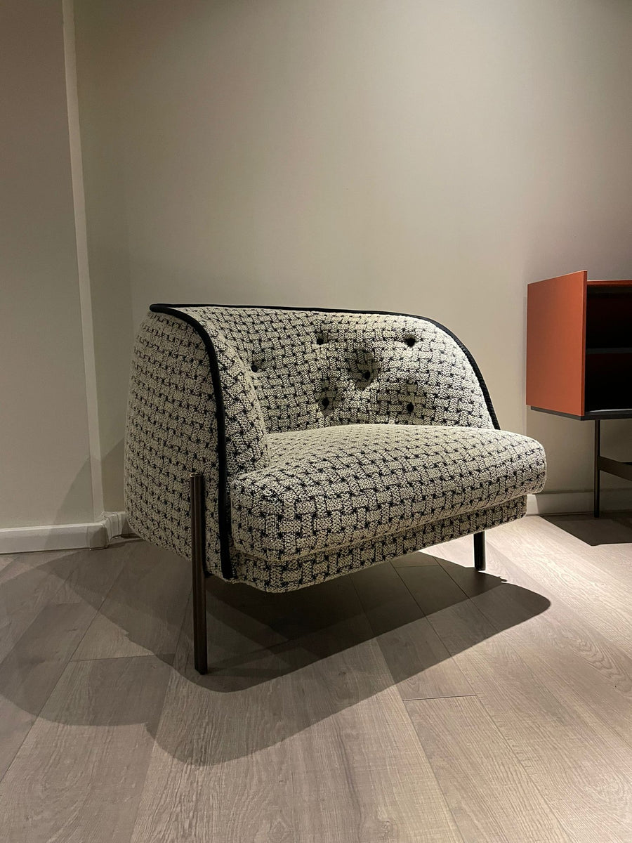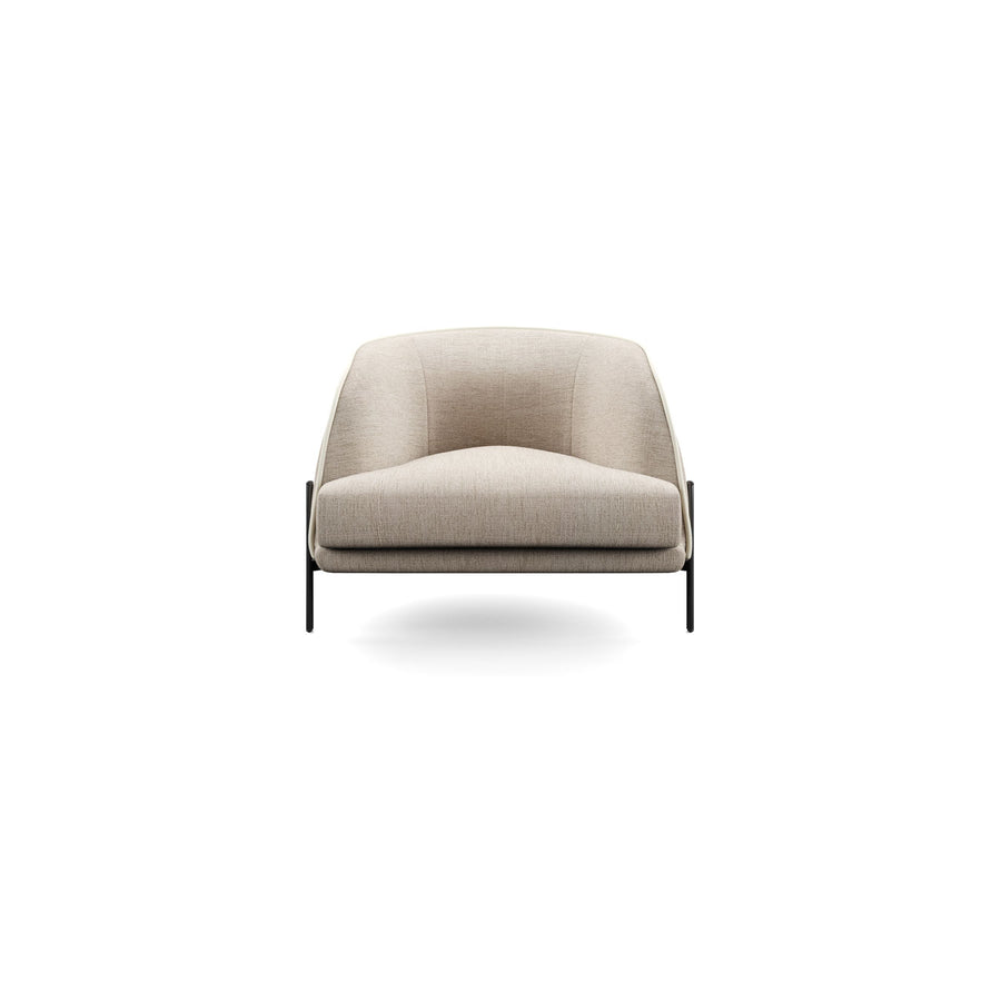 An elegant armchair that owes its personality to the clean and soft lines, the rounded and enveloping shapes, and to the refined and precious details.