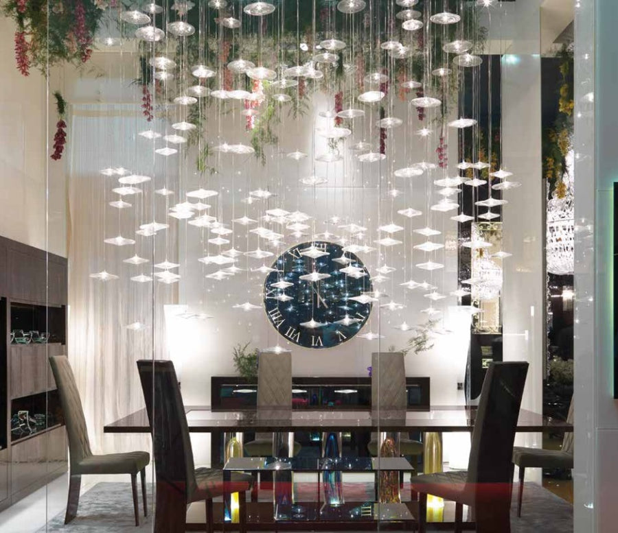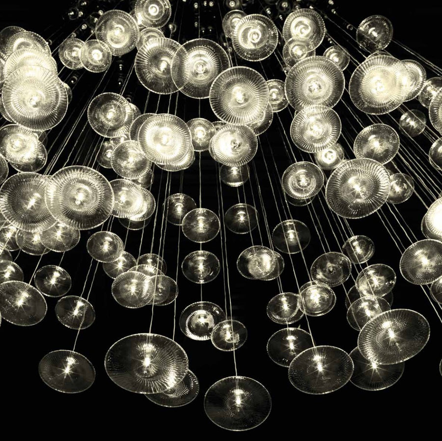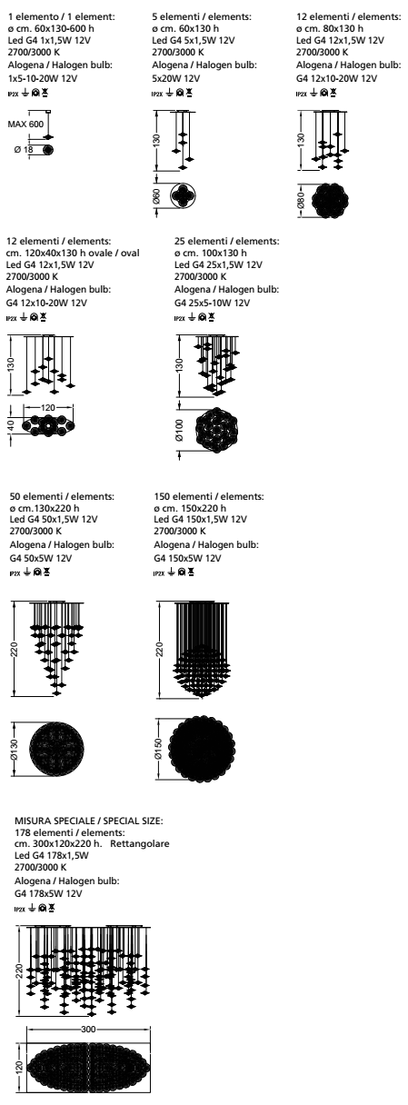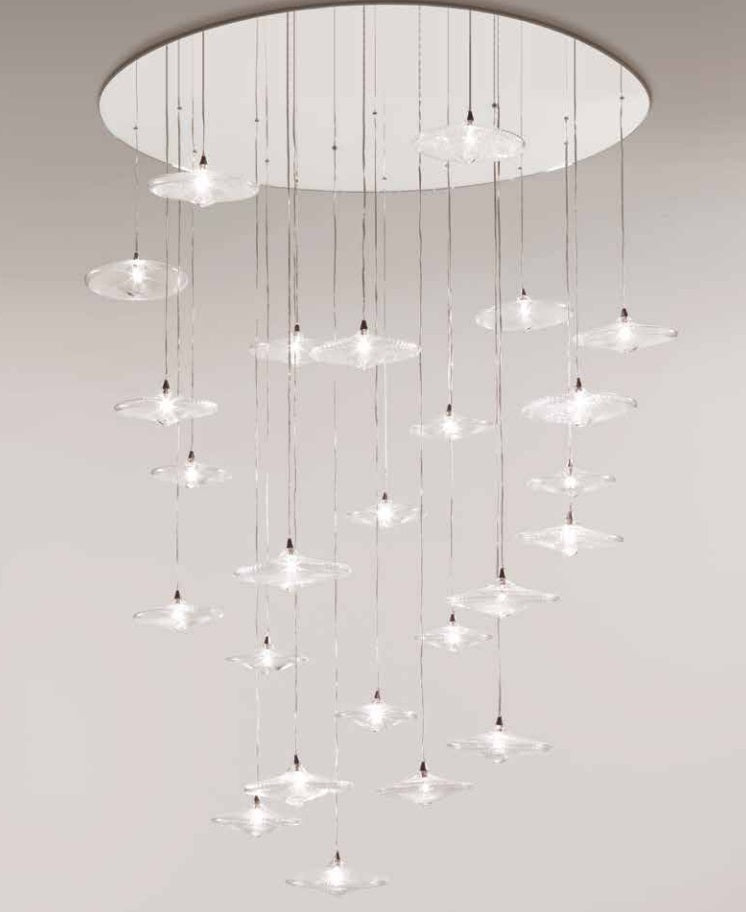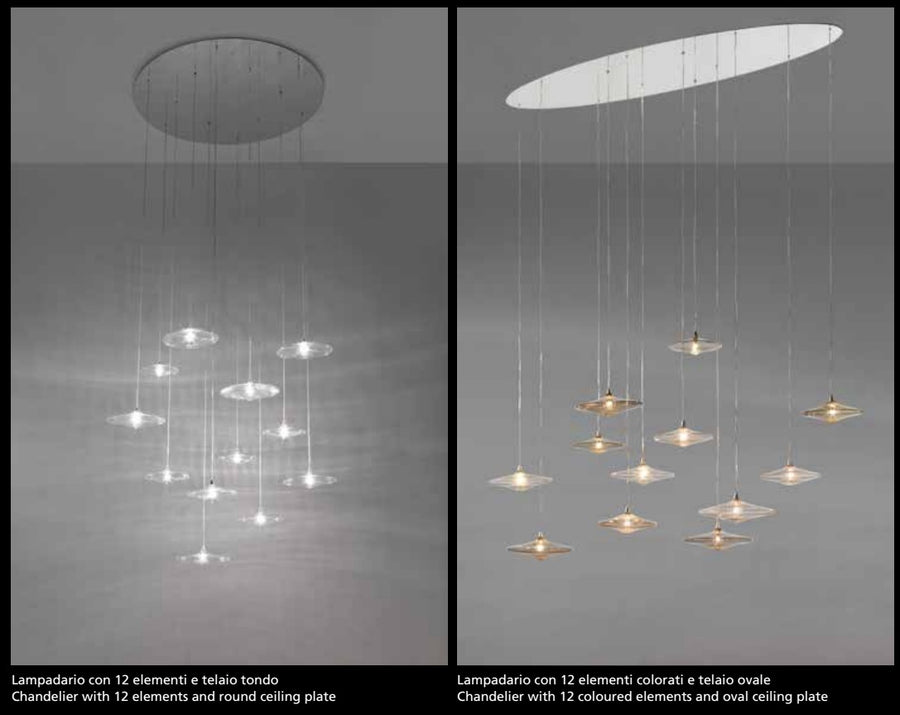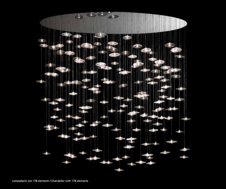Lamp with glass ceiling plate white or black lacquered or in mirror glass. Elements in blown borosilicate glass in transparent or colored finish. Available with 5, 12, 25, 50 or 150 elements. Internal halogen bulbs5W, 10W or 20W. Available also with LED lighting.