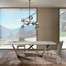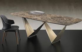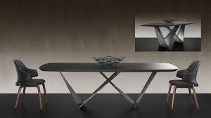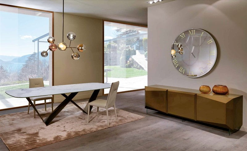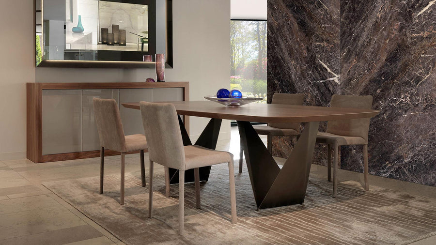 Dining table with base made up of 2 metal elements in graphite finish or in antiqued dark brass, or in shiny steel.Top in transparent glass 15mm thick or in Bevel Wood.