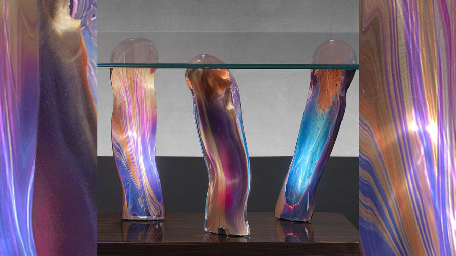 Top in extra-clear glass with perimeter band in 40mm thick shiny ebony or shiny lacquered wood with rounded corners.Special finishes available for the legs on request.