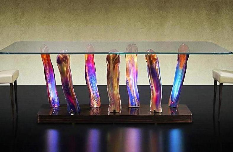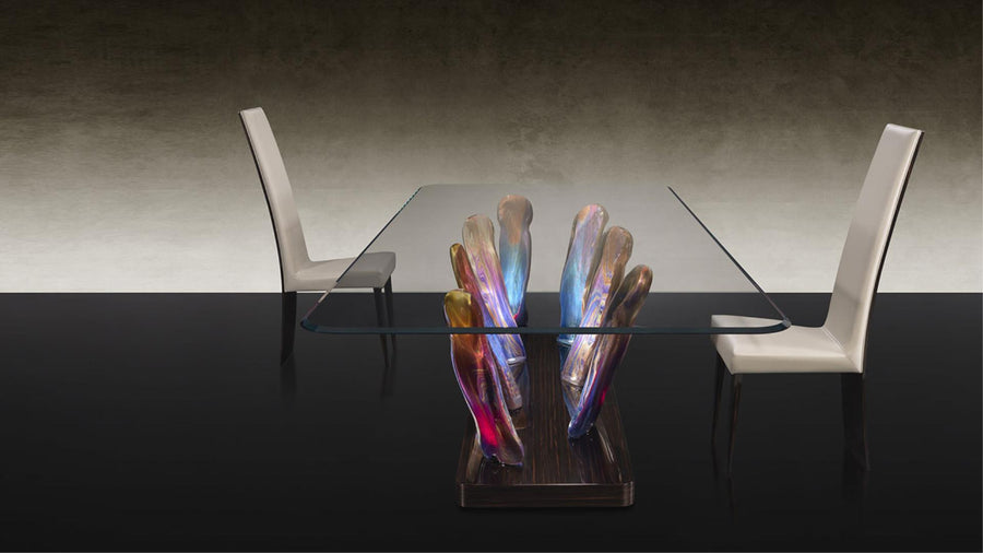 Dining table with base made up of Murano glass legs in 'Calcedonio' or in amber finish and plinth in shiny ebony or shiny lacquered wood. Optional LED lighting system.