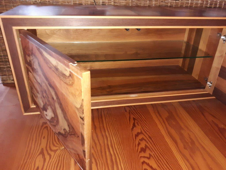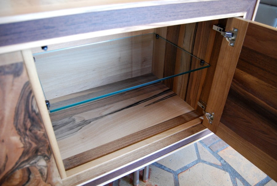 The three doors open effortlessly with a slight push, revealing a glass shelf within. Even the interior of the cabinet is beautifully finished in walnut.