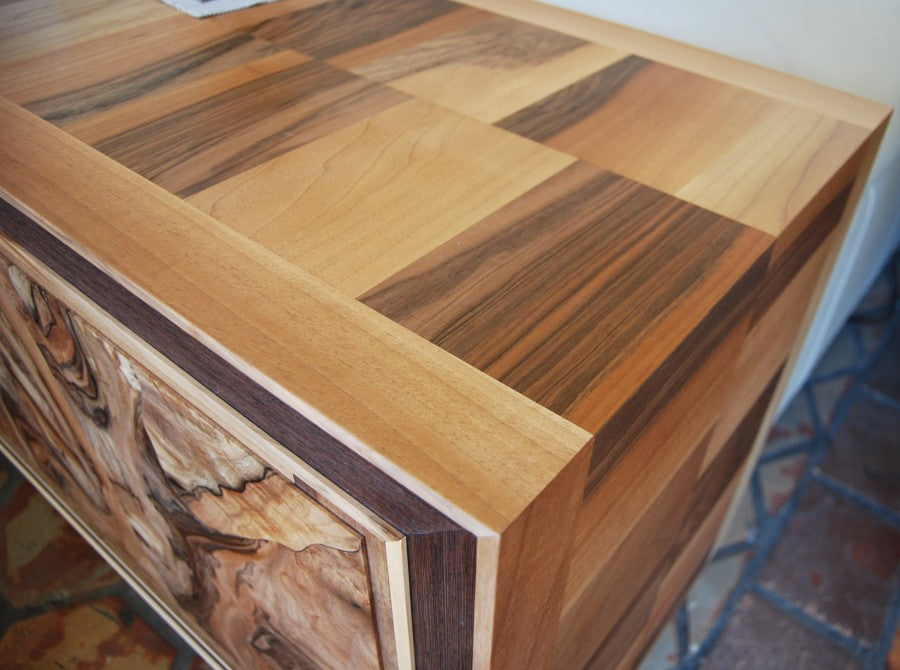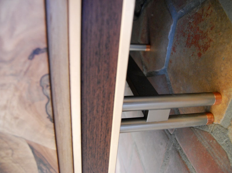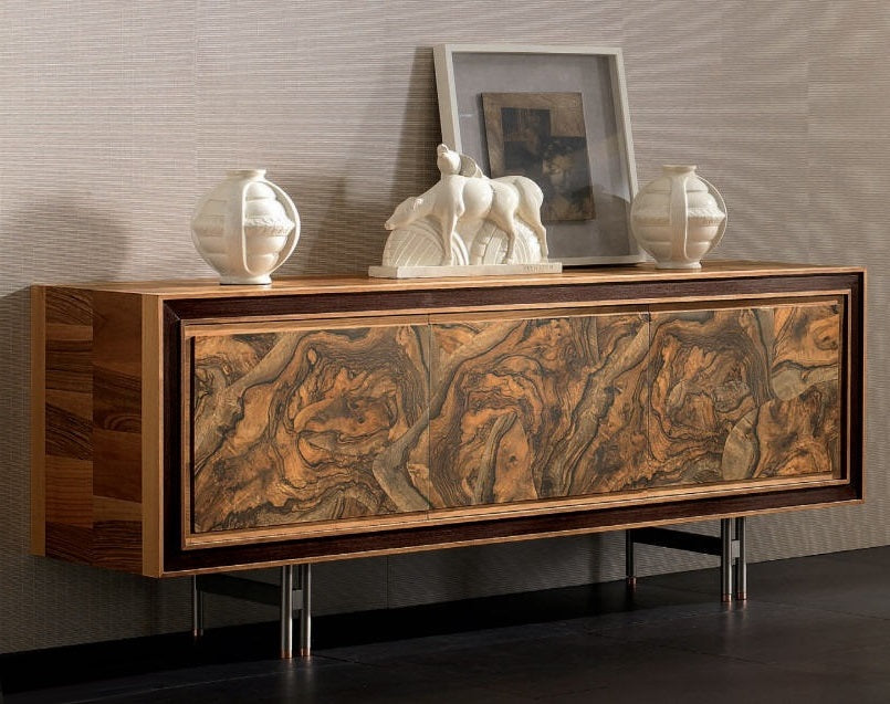 With its beautiful burl wood front, the Toscano Buffet is an exquisite focal point of any room in which it is placed. An undeniable example of the art of woodworking at its finest, this buffet is a striking juxtaposition of clean, minimalist design and warm walnut wood. The top and sides of the cabinet feature walnut of varying grains and color shades that further contribute to the aesthetics of the piece. Additionally, the stainless steel legs with copper tips create a stunning visual counterpoint and lend a floating effect. The result is a dynamic look brimming with originality and stylistic sophistication that is equally at home in the most modern environments or more traditional settings.
