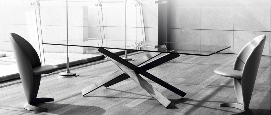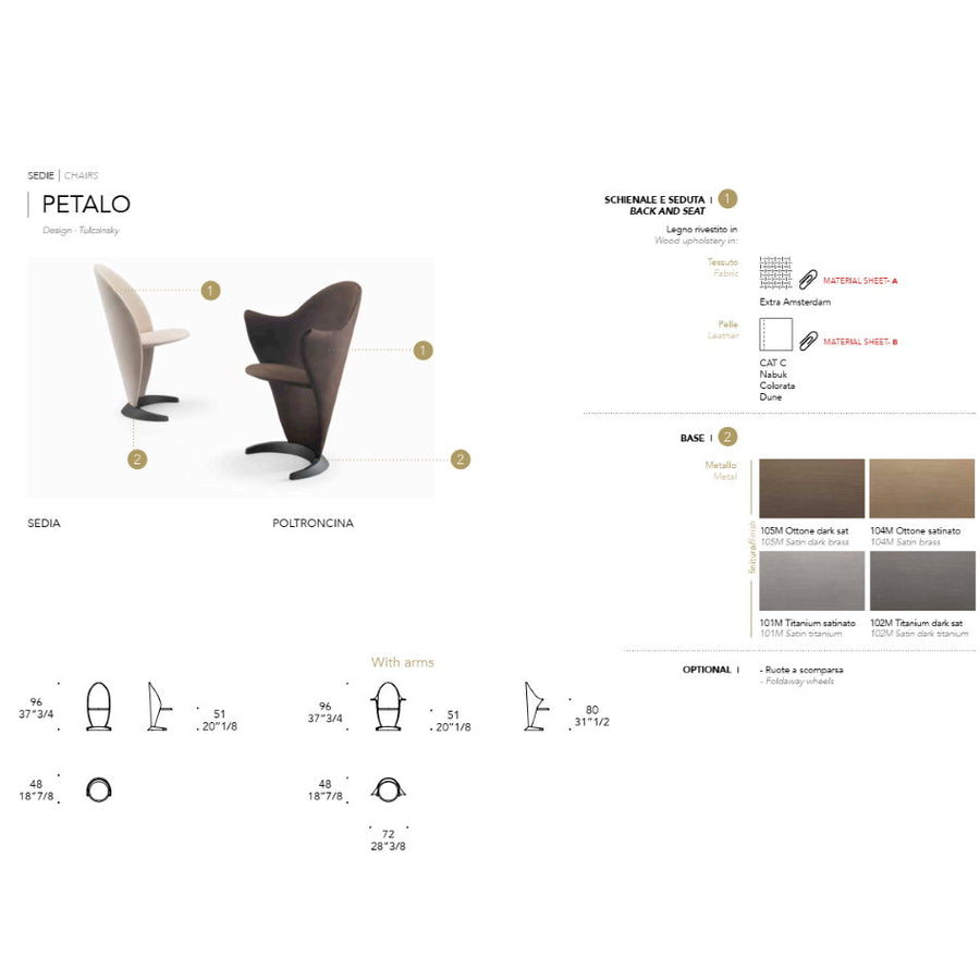 Chair with petal shape available with or without arms. Structure and base available in satin brass [104 M], dark brass [105 M], titanium [101 M] or dark titanium [102M] Available also with foldaway wheels. Covered in leather or fabric.