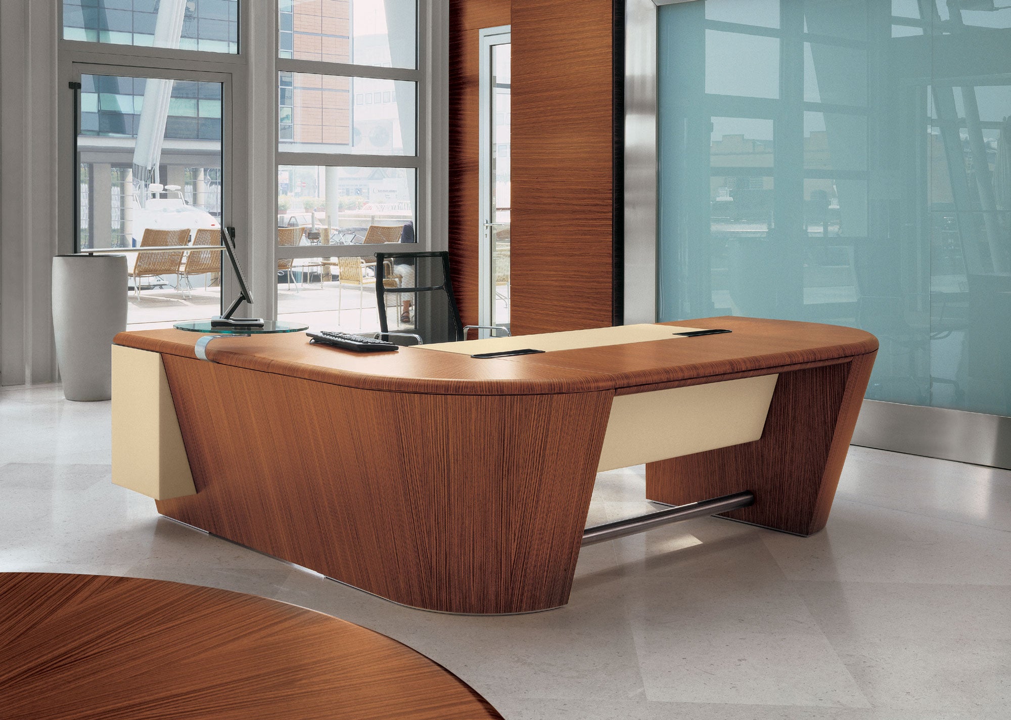 Indulge in the impeccable craftsmanship and sophisticated design of 16 gradi, expertly made in Italy. This collection seamlessly blends function with elegance, offering a variety of modular elements , wood and leather finishes to create a tailored composition. Experience the curved shape and luxurious leather top with optional cable management .
