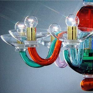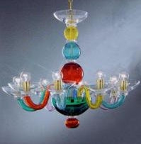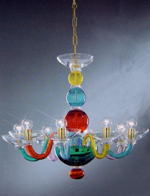 This contemporary Venetian chandelier is hand crafted in the age old tradition of Murano in a beautiful rainbow of colors. The arms are in red, blue, cobalt blue, smoke, yellow, rose, green and light green. The chandelier hangs by an adjustable gold chain.
