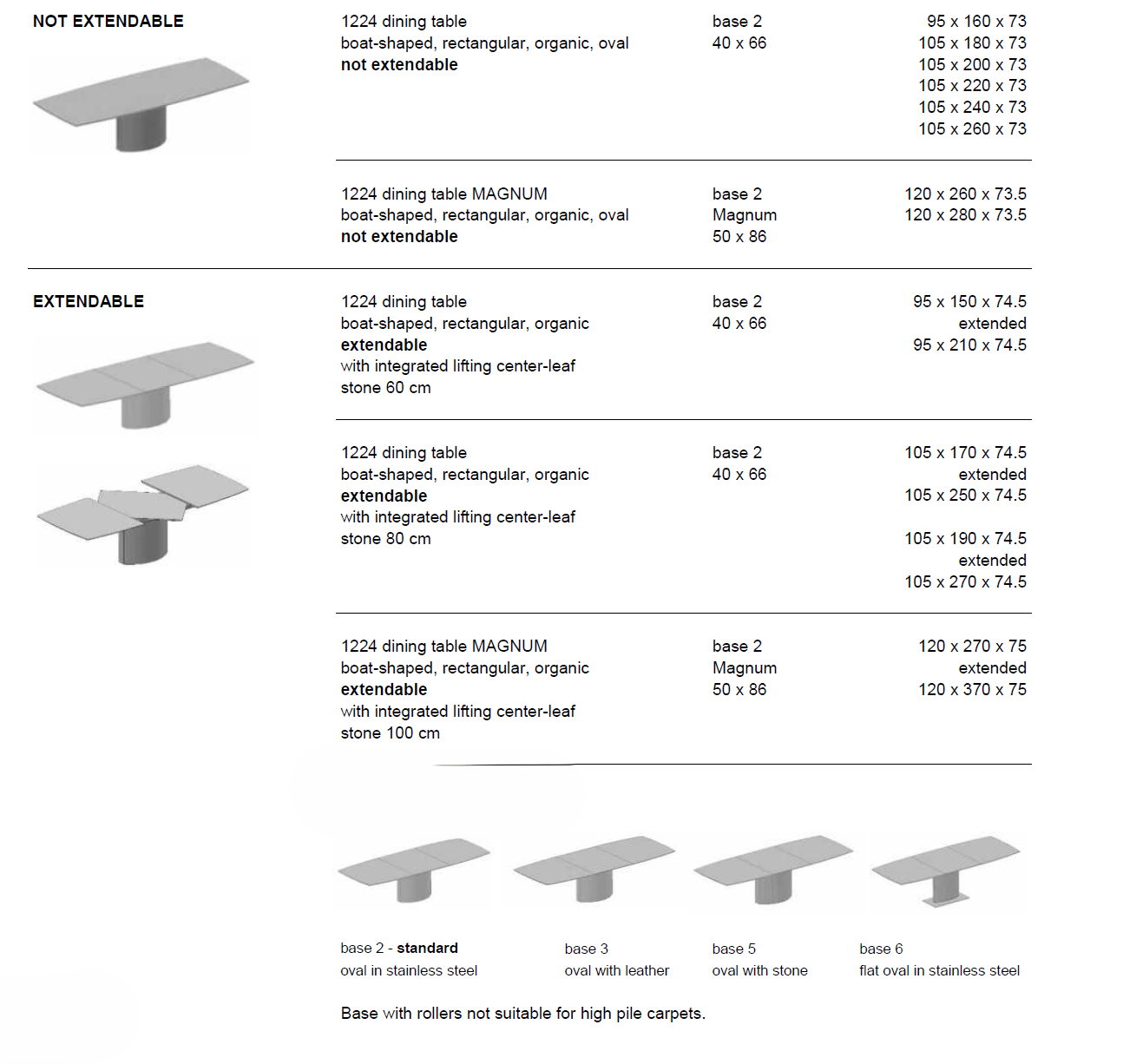 The Adler 1224 Dining Table is available fixed or expandable , boat-shaped,,organic or oval, with natural stone or wood with lifting mechanism for an integrated center-leaf made of natural stone or wood. The integrated lifting mechanism allows the interior central leaf to be raised once the two halves of the table top have been pulled apart. An ingenious technique makes the extension a procedure of miraculous ease. This model is offered with 4 different bases.
