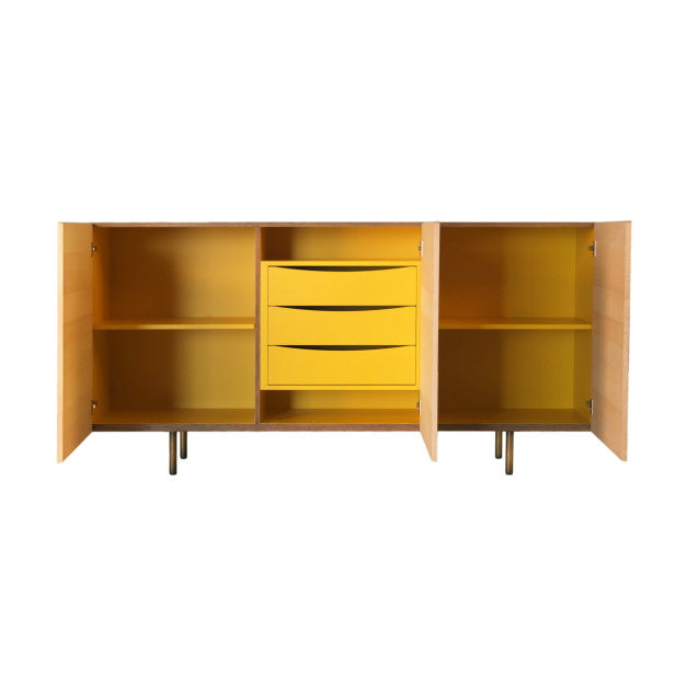 Colored interior with 2 shelves and 3 drawers in the central compartment. Brass feet.