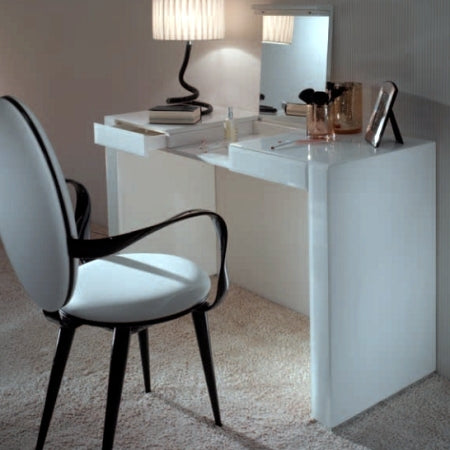 Desk/toilette unit in shiny polyester lacquered wood, latte or black, with glass details and folding mirror.