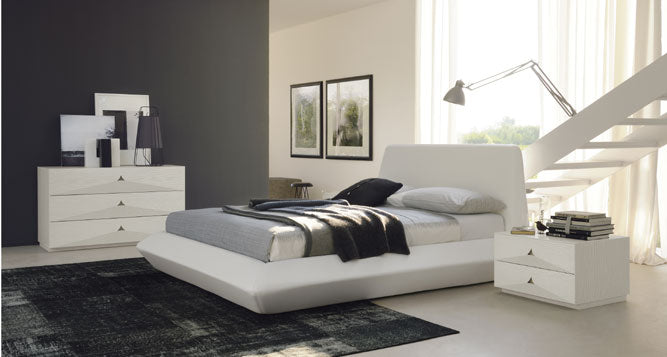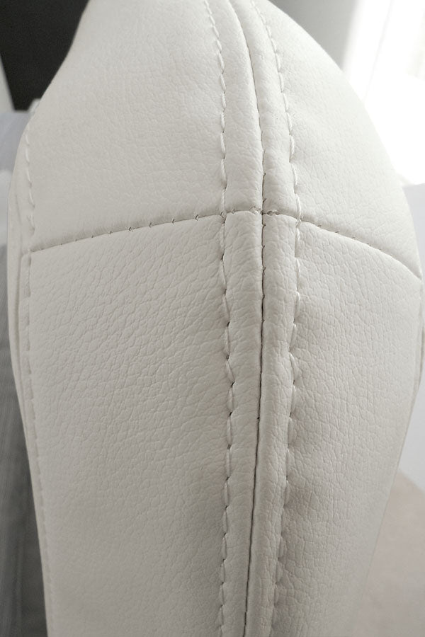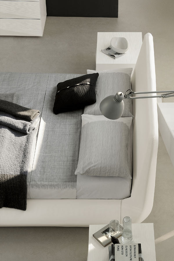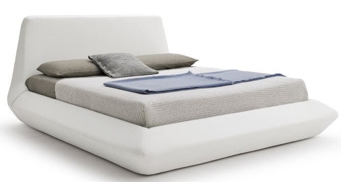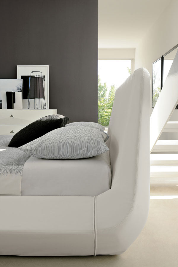 The uniquely angled platform and headrest of the Bergamo bed convey a sense of modern minimalism. Softly padded throughout, the bed has no ornament other than its saddle stitched seams.
