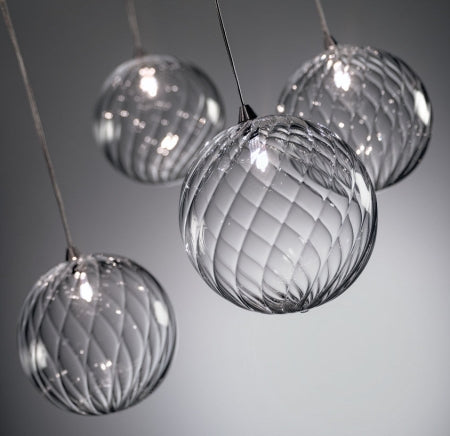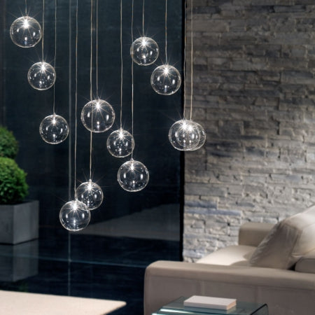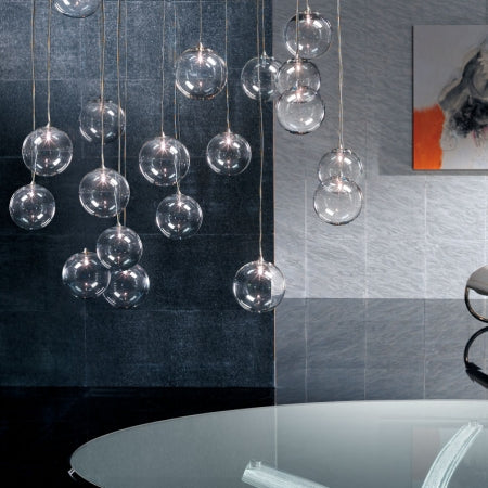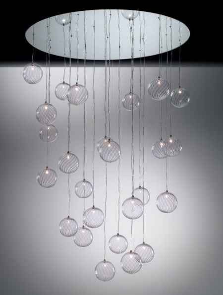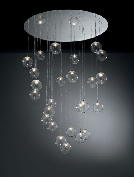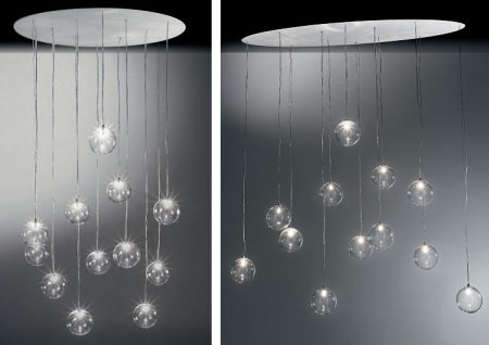 Chandelier with paintedglass support in whiteor black lacquered or mirrorfinish. The suspension can beprovided with 5, 12, 25 or 50 spheres in blown glass in smooth or "à torchon" finishwith bulbs 10W or 20W inside. Made by Reflex