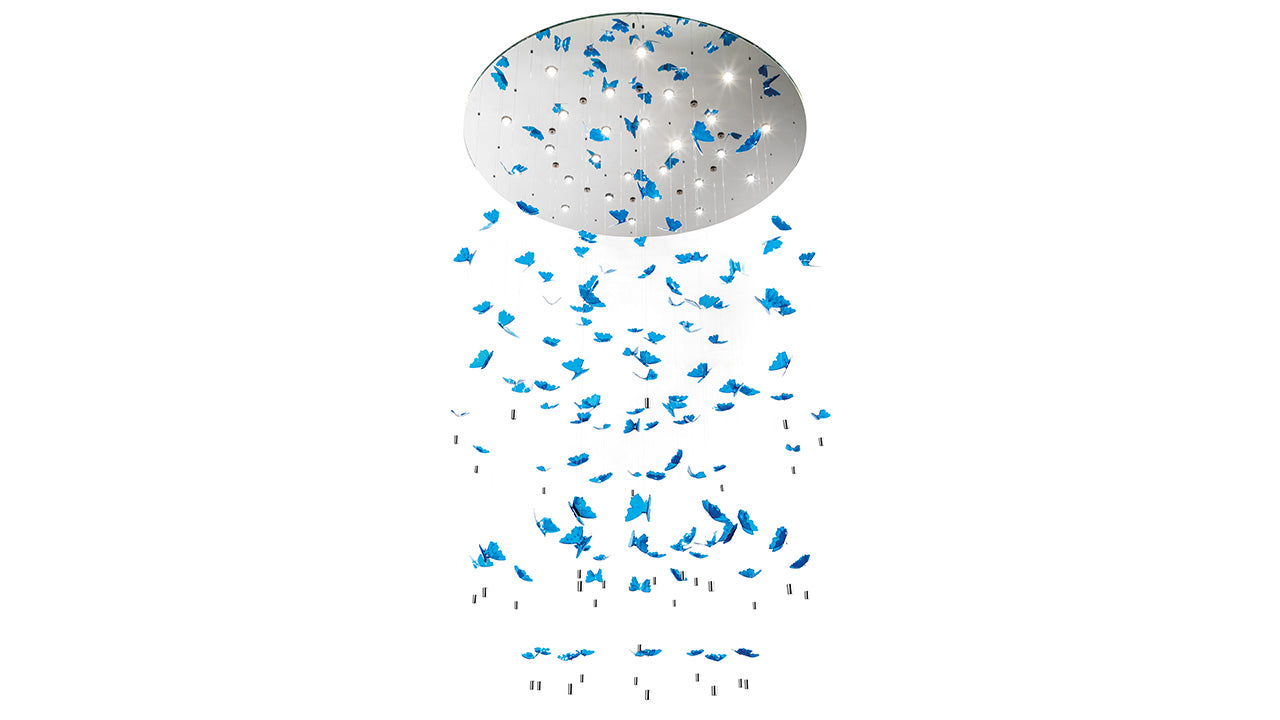 Pendant lamp with a mirrored glass support featuring recessed LEDs and hanging butterflies of various sizes made of hand-painted glass. Polished steel details add a finishing touch.