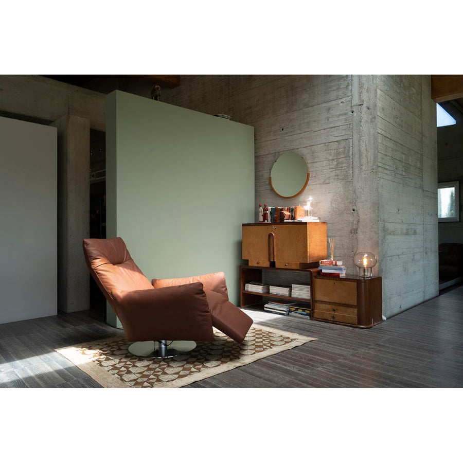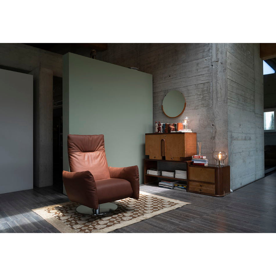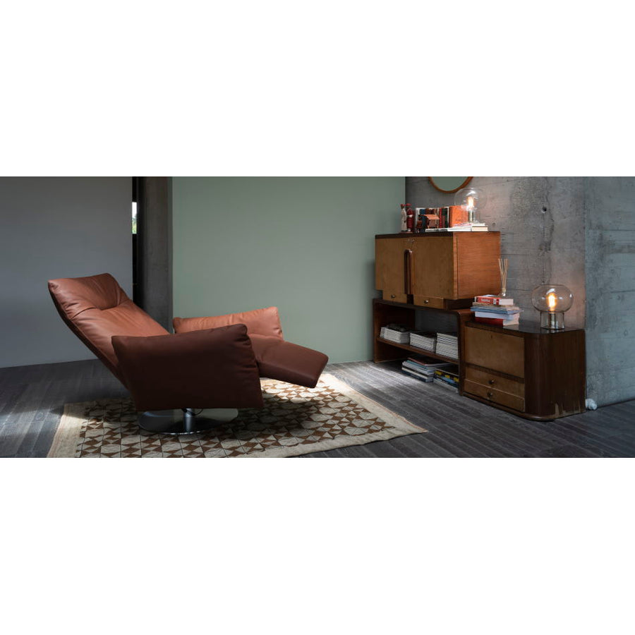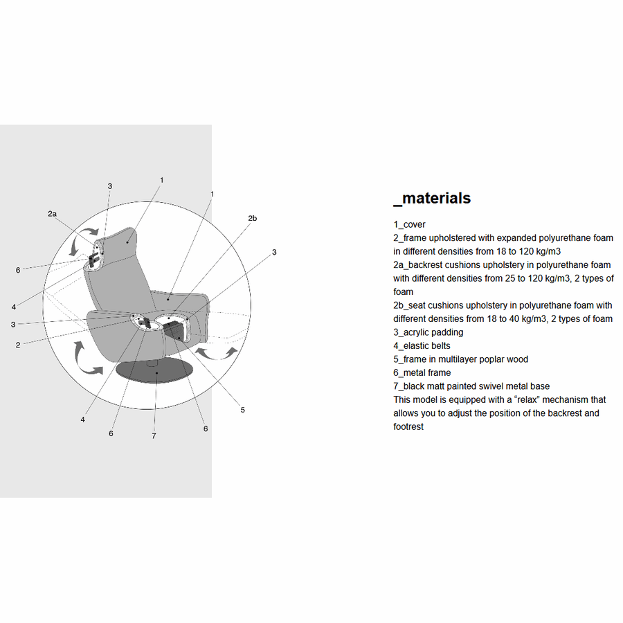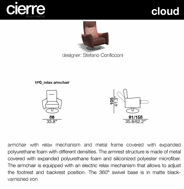 Extremely comfortable high backrest, electric reclining mechanism, electric footrest and swivel base.