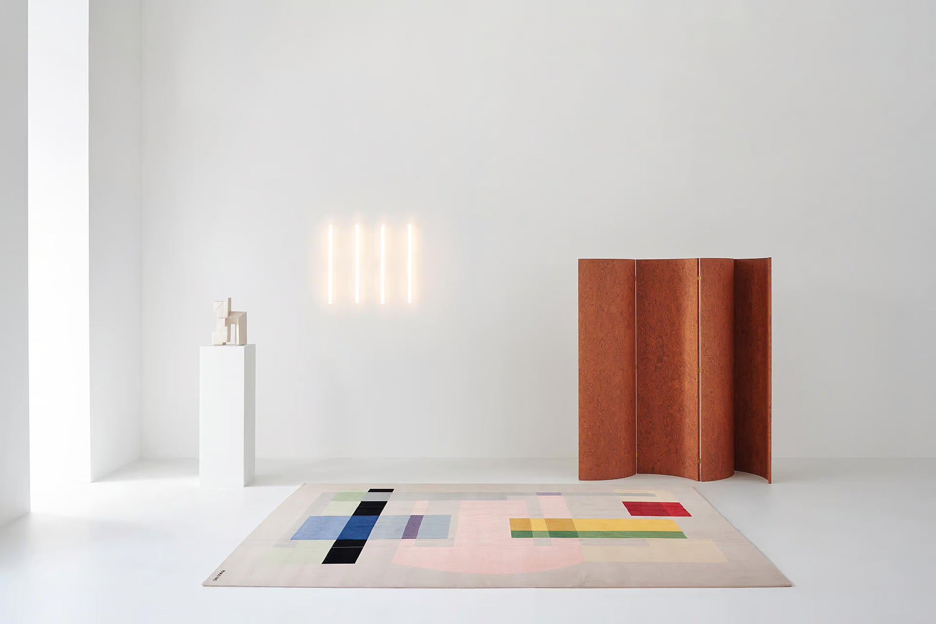 The Composizione 57 12 deigned by Manilo Rho arose from the desire to produce carpets that reproduce the pure shapes and the particular palette of Manlio Rho, to replicate the warmth of its colors that are actually borrowed from the outlying Lombard countryside. The carpet becomes a canvas on which sketch graphic compositions of polygonal figures, arrayed, interlocked and intertwined, in unique color palette.