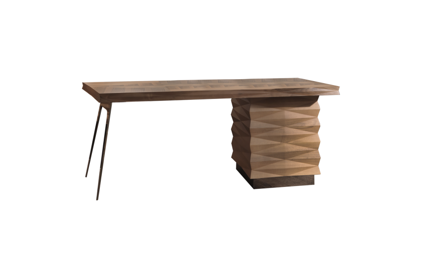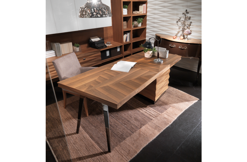 The Veneto Desk is meticulously hand crafted in Italy using natural walnut and stainless steel to create a perfect balance between the warmth of natural wood and architectural styling. The drawers have beautifully detailed faceted geometric woodworking in natural walnut. This faceted theme is expressed in the masterful woodworking on the inlaid walnut top to complete the composition of this elegant and timeless design. The legs are stainless steel.