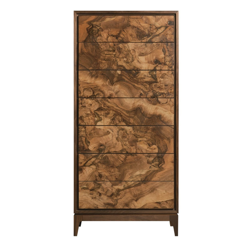 With it's beautiful burl wood drawer fronts , the Burlwood Tallboy is an exquisite focal point of any room in which it is placed. An undeniable example of the art of woodworking at its finest, the Burlwood Tallboy is a striking juxtaposition of clean, minimalist design, hand selected burlwood and warm solid walnut wood. The result is a dynamic look brimming with originality and stylistic sophistication that is equally at home in the most modern environments or more traditional settings.