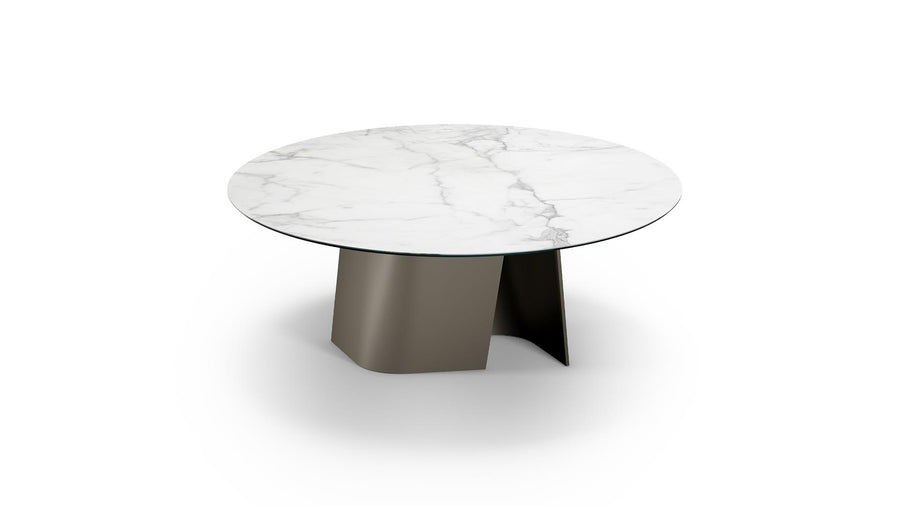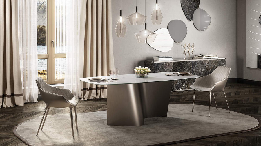 Dining table with bases in curved extra clear glass 15mm thick with Bronze, brass, dark brass and titanium finish. Top in transparent glass or in MarmoReflex. Also available with Bevel Wood top.