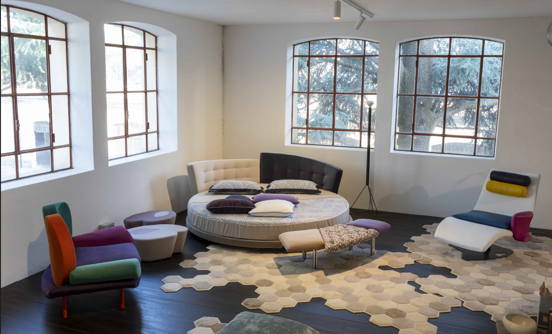 The iconic round Felix Bed Set QS and coordinating bench, chairs and ottoman is expertly crafted in Italy by Il Loft.