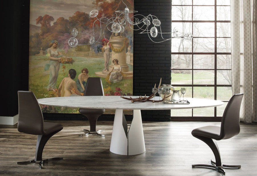 Table with base in white (GFM71), black (GFM73) or graphite (GFM69) embossed lacquered steel. Top in matte white Carrara (BCO) marble or Canaletto walnut (NC) or burned oak (RB) wood. Optional central swiveling tray in white, black or graphite painted extra clear frosted glass.