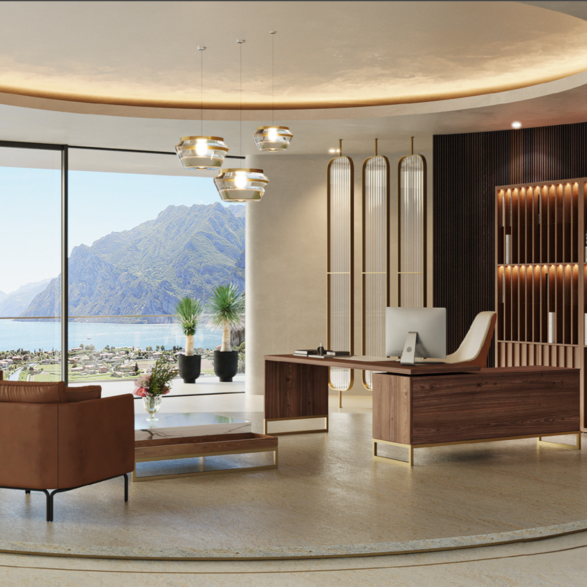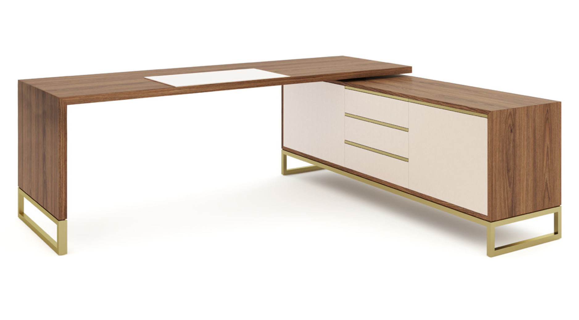 gold satin finish, desk kit, magazine rack & front of doors/drawers in