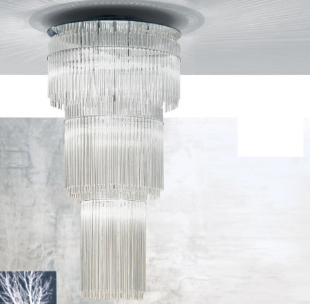 Chandelier with mirror Chandelier with mirrorframe equipped with frame equipped withhalogen bulbs 240W/360W. halogen bulbs 240W/360W.Murano glass sticks Murano glass sticksavailable in transparent, available in transparent,black, amethyst or black, amethyst or aquamarine finish. Made by Reflex