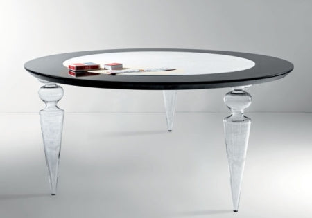 The height is 28.4” and it is available in 63” diameter with 3 Murano glass legs or 71” diameter with 4 Murano glass legs. The the legs are available in Murano glass in transparent glossy finish or in black, blue-grey, amber, red, amethyst, tobacco and light grey color.