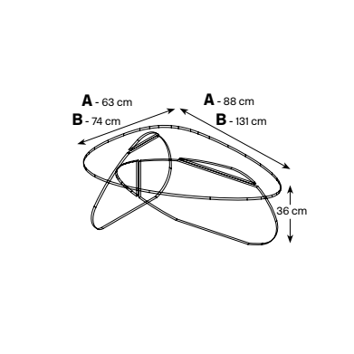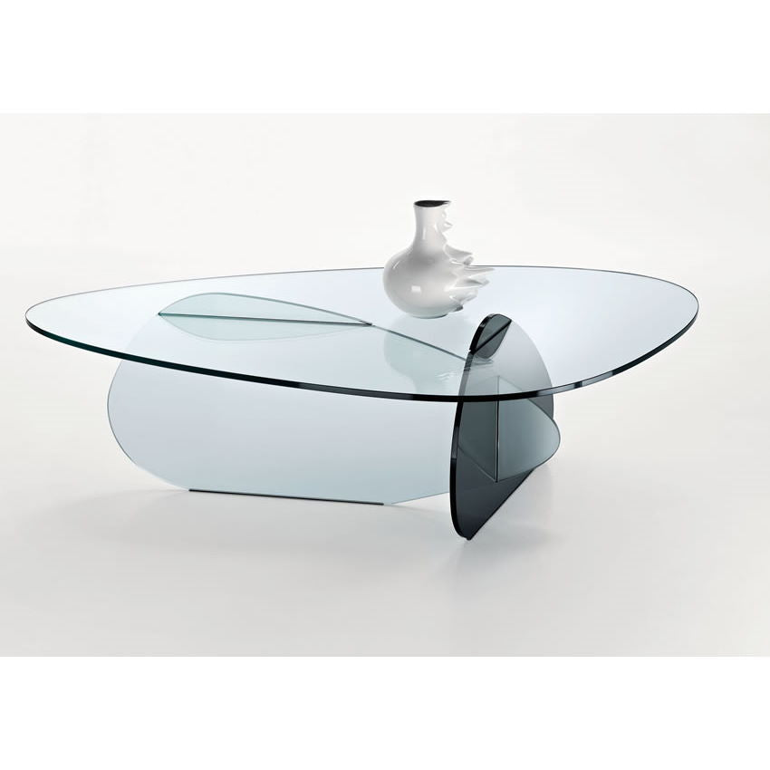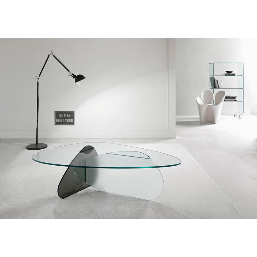 Three glass plates that seem to cross each other form this low table made of three different kinds of glass: smoked, frosted and transparent. Top available in two sizes. Thickness 12 mm.