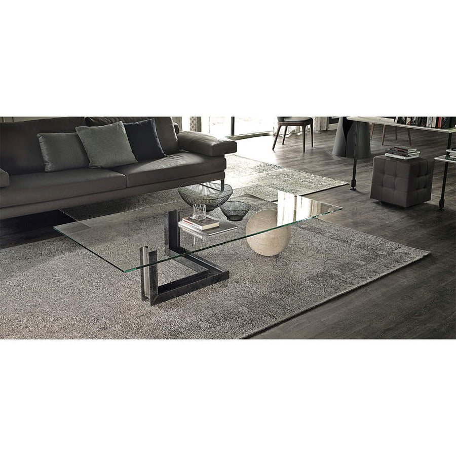 Coffee table with transparent varnished metal base (OP0) and Travertine (TN) sphere. Top in clear glass. The finish of the base OP0 identifies a transparent coating on ferrous raw material. The presence of more or less obvious stains, color variations, scratches and irregular edges is feature of the special material processing and should not be considered a defect.