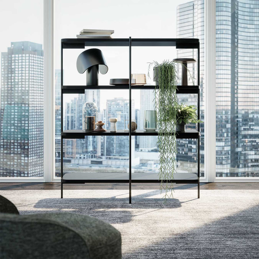 In the two-shelf version the bookcase is transformed into an essential pass par tout that completes with elegant discretion every interior project.
