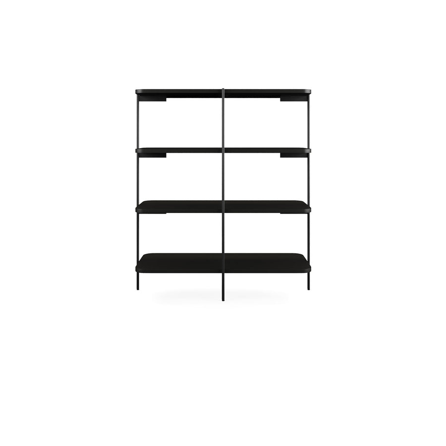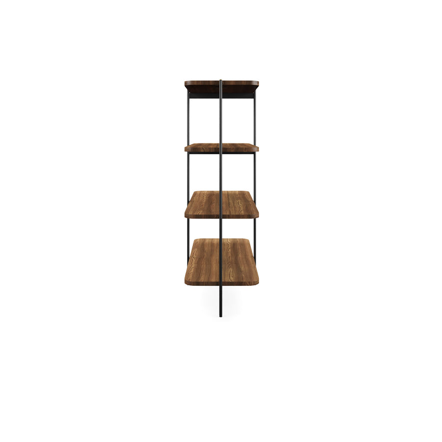 A bookcase with apparently floating shelves on a structure composed of powder-coated metal brackets.