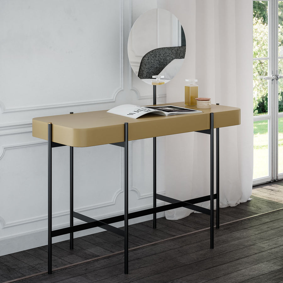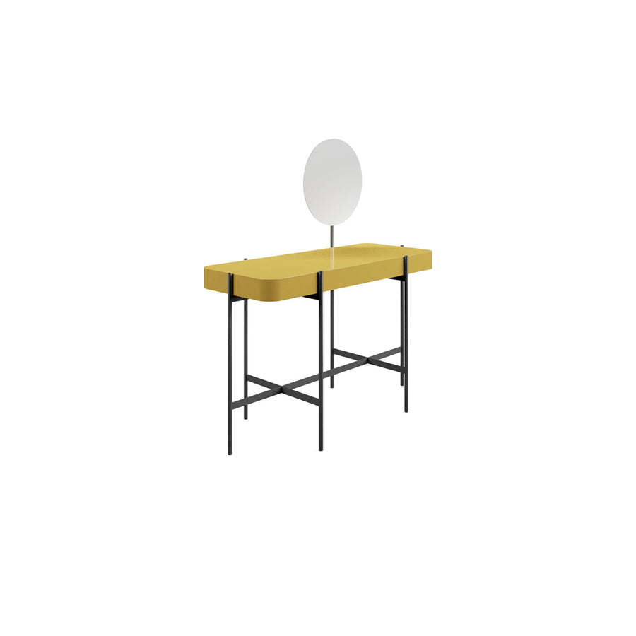 A pop and transformable element that contains three different souls: make-up set, desk, and console.