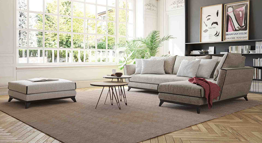 A new concept for the sofa in the two or three-seater version with a lounge chair calibrated in size and in dry volumes.