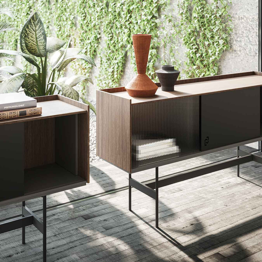 Pixi cabinet easily transforms into a coffee table, sideboard, cupboard, or bedside table, adding or removing supports and mixing accessories and details: glass, metal, wood, and color variations.