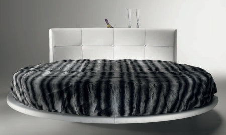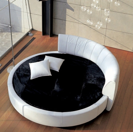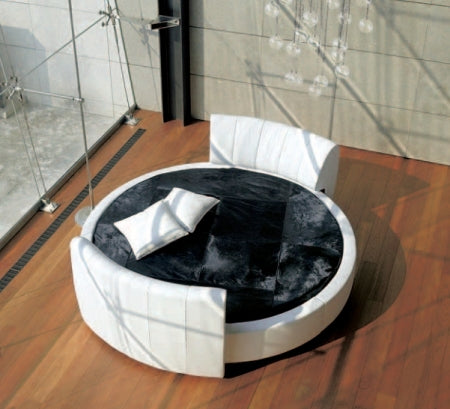 Round bed covered with leather. Available with fix headboard or with doubleheadboard with 360° rotating mechanism.