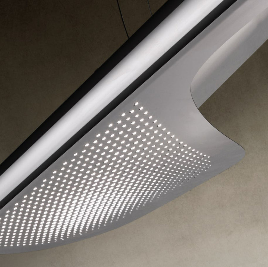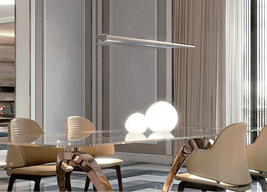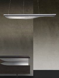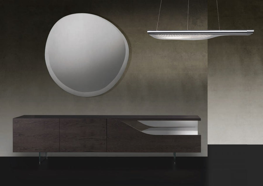Chandelier with structure in mirror glass. Pendant curved shiny steel element. LED lighting system.