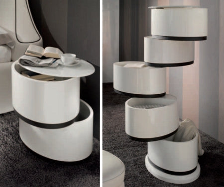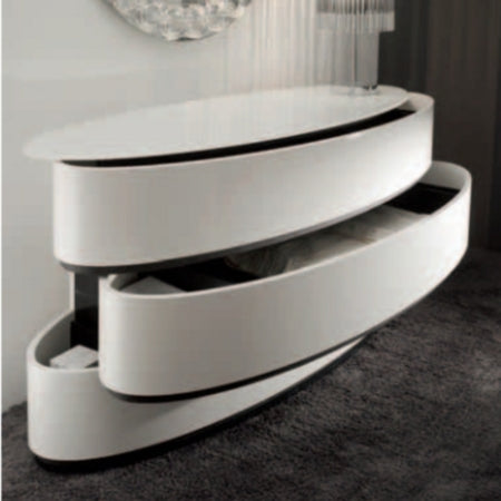 Bedroom furniture in curved wood in shiny polyester lacquered finish with top in lacquered glass. Available also in mattelacquered finish, wengè finish or in matte ebony wood. Drawers with leather details.