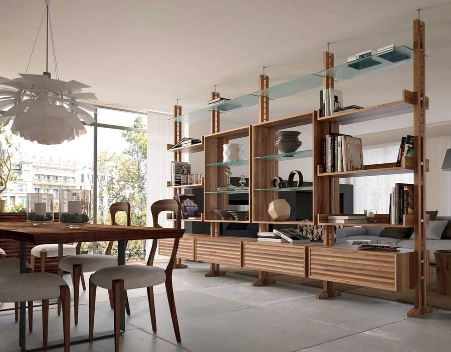 The Natura Wall system's modular elements allow you to combine drawers and wooden or glass shelves to be customized to your requirements.