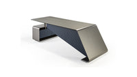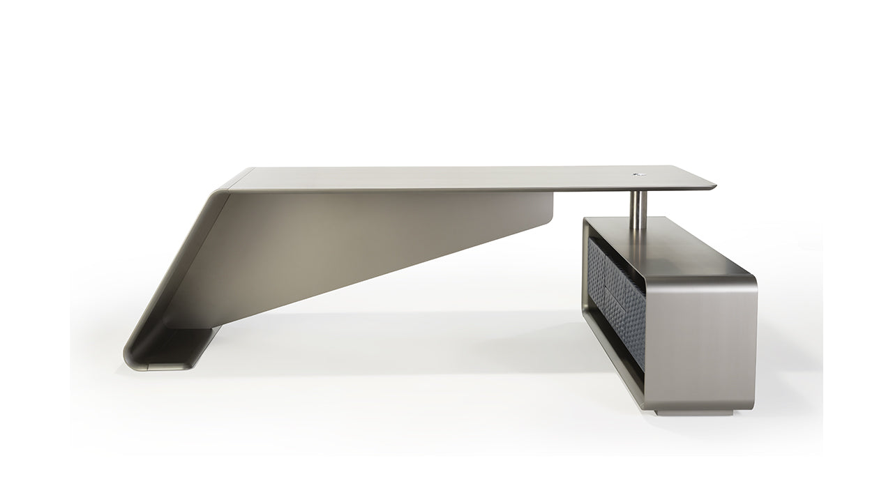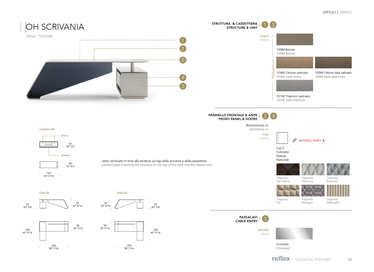 Desk with structure and top in wood in brass, dark brass, titanium finish. Front panel covered in quilted leather. Support in polished chrome with cable hole.