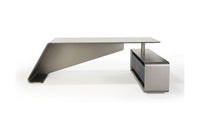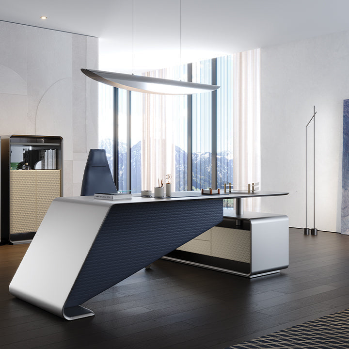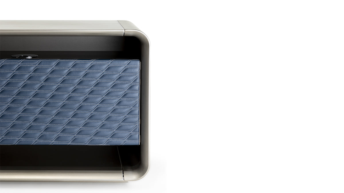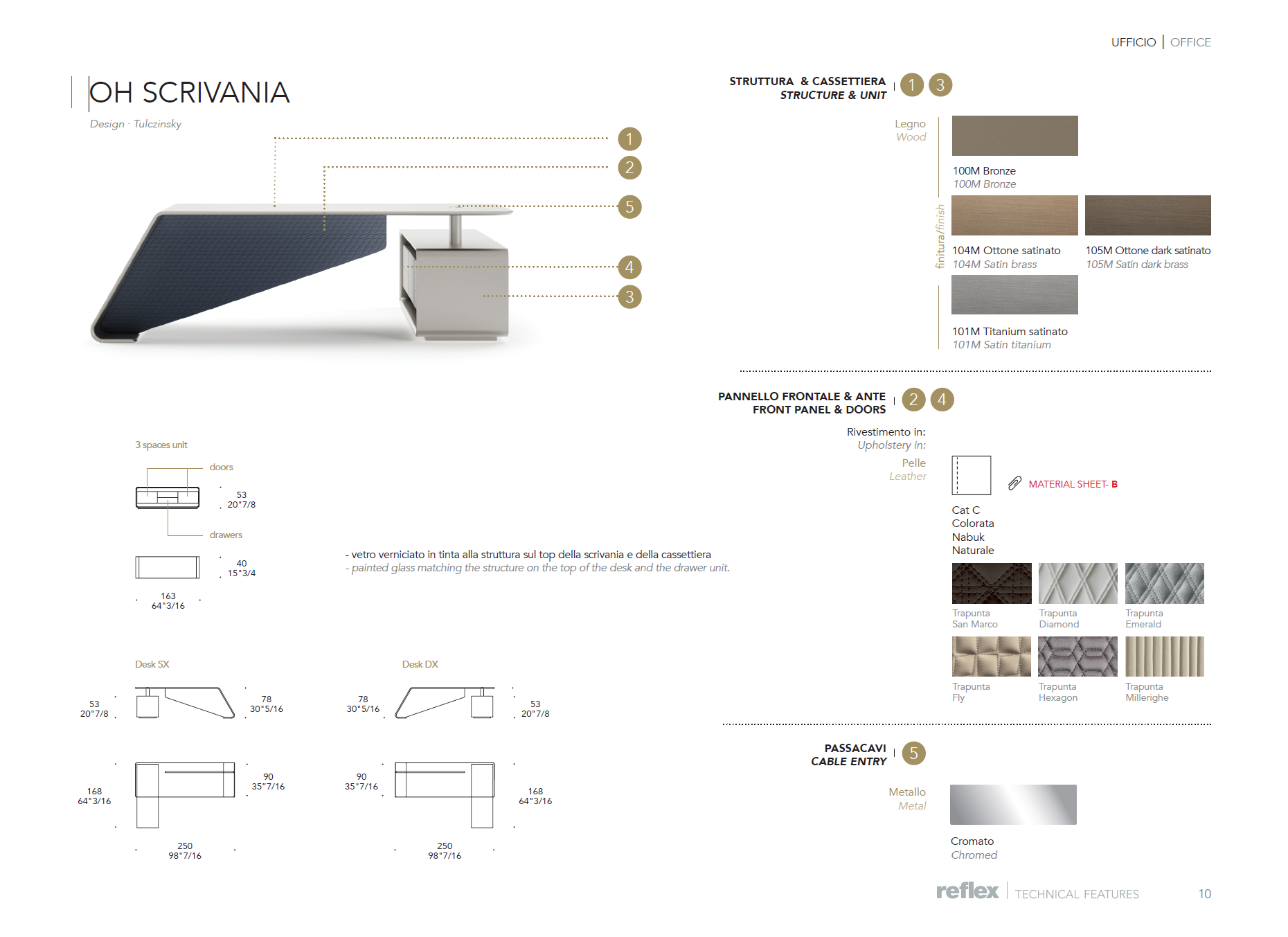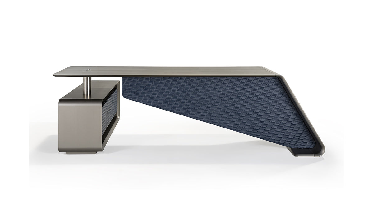Side container with 2 drawers and 2 doors covered in quilted leather (matching front panel). Painted glass matching the structure on the top of the desk and the drawer unit.