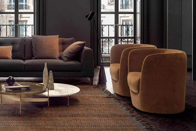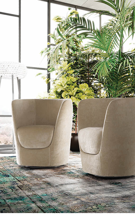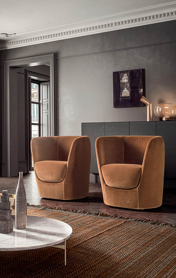 Eclectic and elegant, Oplà is the armchair equivalent of a warm, romantic embrace. A modern tub chair designed with rounded lines from head to toe and featuring prominent volumes and proportions offering comfortable, wraparound support. The seat consists in a high, soft cushion designed to slot perfectly into the hollow in the middle of the carcass. Resembling the veins of a flower, the stitching on the inside of the backrest plays up the harmonious geometry. Available the version with removable fabric covers and the non removable leather upholstery version. The base can be fixed or comes in a swivel version with auto- return mechanism.