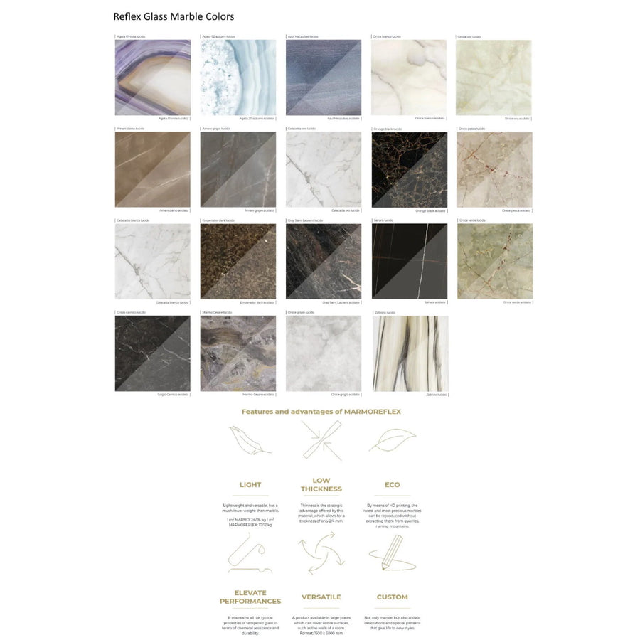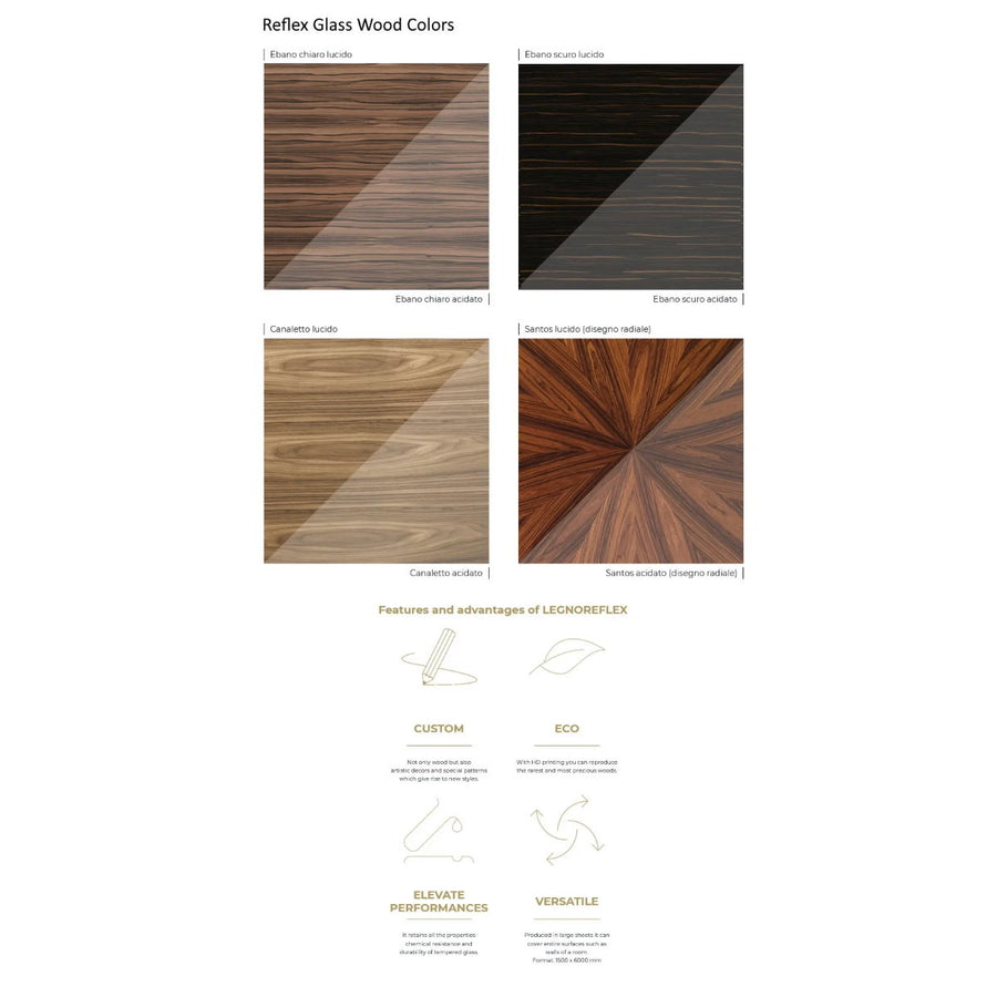 Tops available with transparent glass, extra-clear glass, MarmoReflex , LegnoReflex and Canaletto walnut or Canaletto Walnut with Henné finish or with Bevel Vetromarmo.