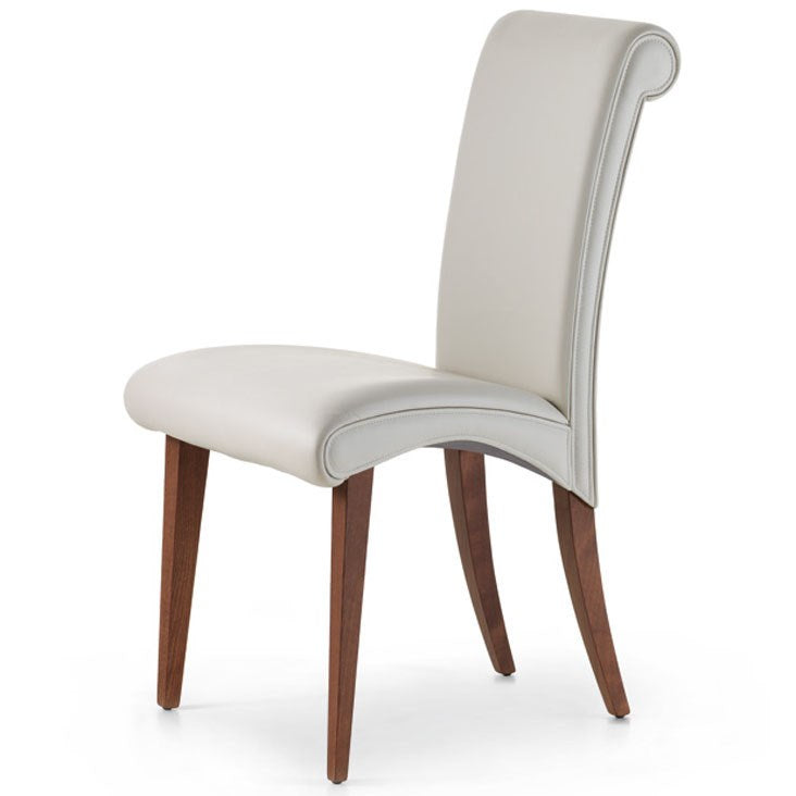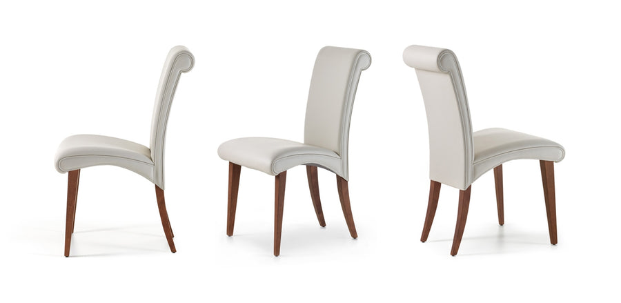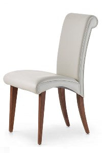 It is covered in Ivory leather with Walnut stained legs and is available as a side or arm chair.