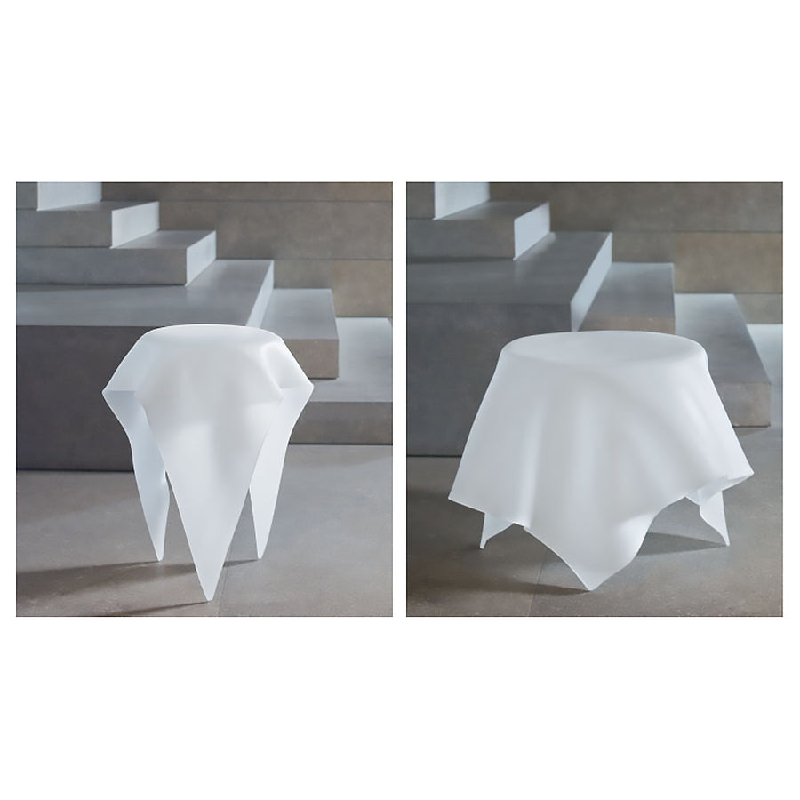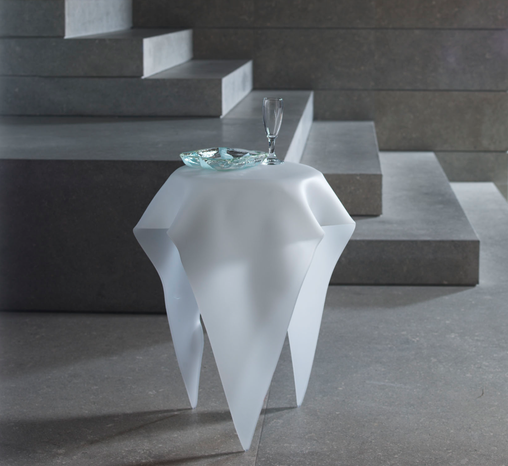 Collection of low tables in curved extra-clear glass in white, bronze or smoke-grey etched finish. Available also in etched lacquered glass in the standard colors.