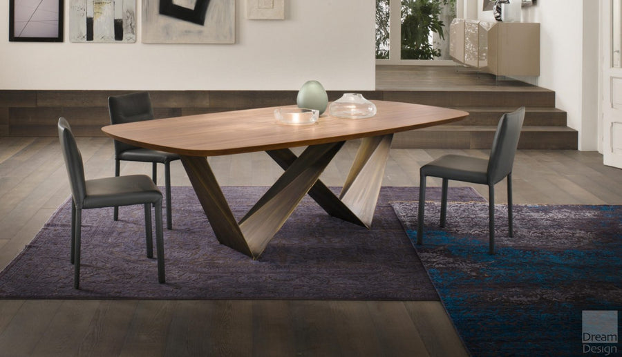 Dining table with base made up of four elements in extra-clear glass, 15 mm thick.Oval or rectangular top with 45° bevel.Base available also lacquered in standard colors.